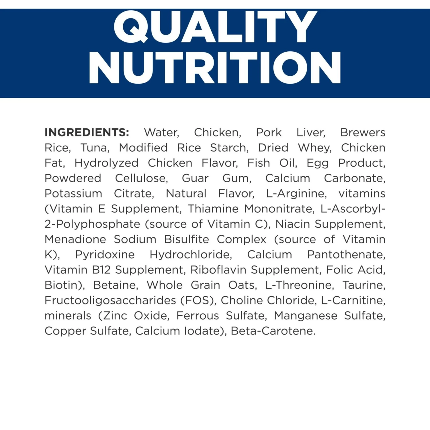 Hill’s Prescription Diet k/d Wet Cat Food with ActivBiome+ Kidney Defense is specially formulated by nutritionists and veterinarians to help manage chronic kidney disease, or CKD. A proprietary blend of prebiotics activates the gut microbiome to help reduce harmful waste products within the intestinal and slow down the progression of the disease. In addition, high levels of essential amino acids and L-carnitine support your cat’s natural ability to build muscle mass. Made to please even the pickiest of eaters, this canned food is made with real tuna and has a smooth texture with an irresistible taste that cats love.