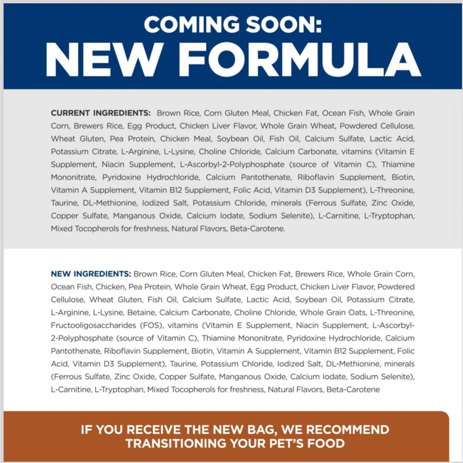 Pets can be sensitive to sudden changes in their diets. For this reason, it is extremely important to follow a gradual transition plan to best support your pet’s health and product effectiveness. Ask your Veterinarian about the best way to transition your pet to a new food.