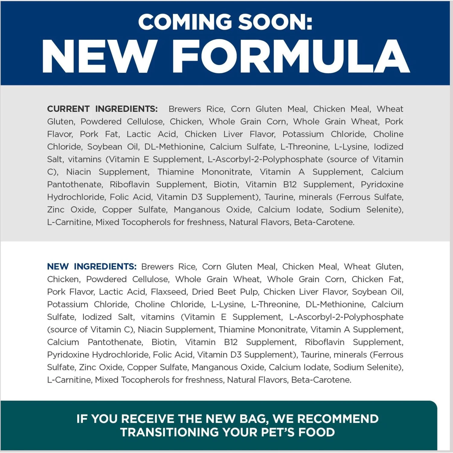 Pets can be sensitive to sudden changes in their diets. For this reason, it is extremely important to follow a gradual transition plan to best support your pet’s health and product effectiveness. Ask your Veterinarian about the best way to transition your pet to a new food.