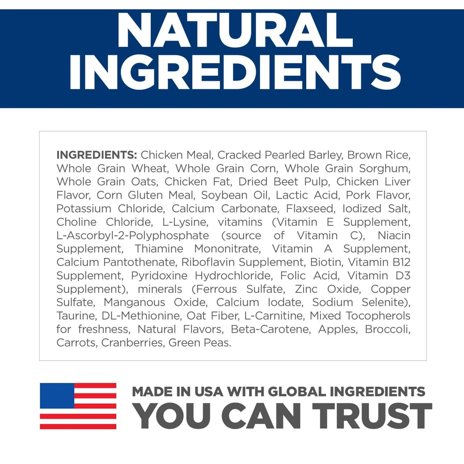 Hill’s Science Diet Adult 7+ Small Bites Chicken Meal, Barley & Rice Recipe Dry Dog Food provides your pup with precise nutrition for a healthy lifestyle. Made with wholesome ingredients such as savory chicken meal, rice and barley, this nourishing recipe is balanced to meet your pet’s needs, maintain an ideal weight, and promote healthy skin and coat. Manufactured in the United States, every ingredient meets strict requirements for purity and nutrient content which exceed industry standards. Formulated for adult dogs 7 years of age and older, this Hill’s Science Diet provides your pooch with the nutrition he needs for a lifetime of health and happiness.