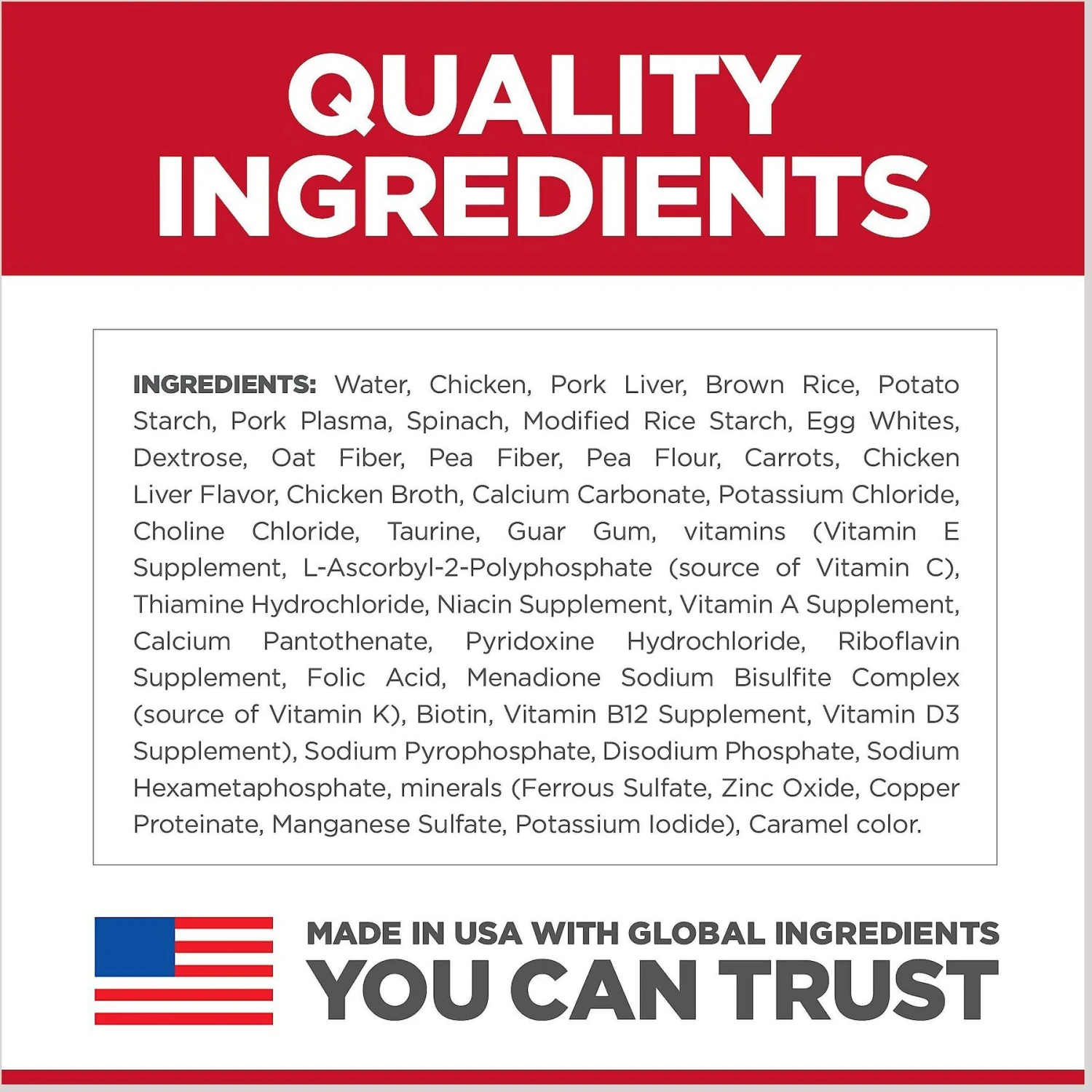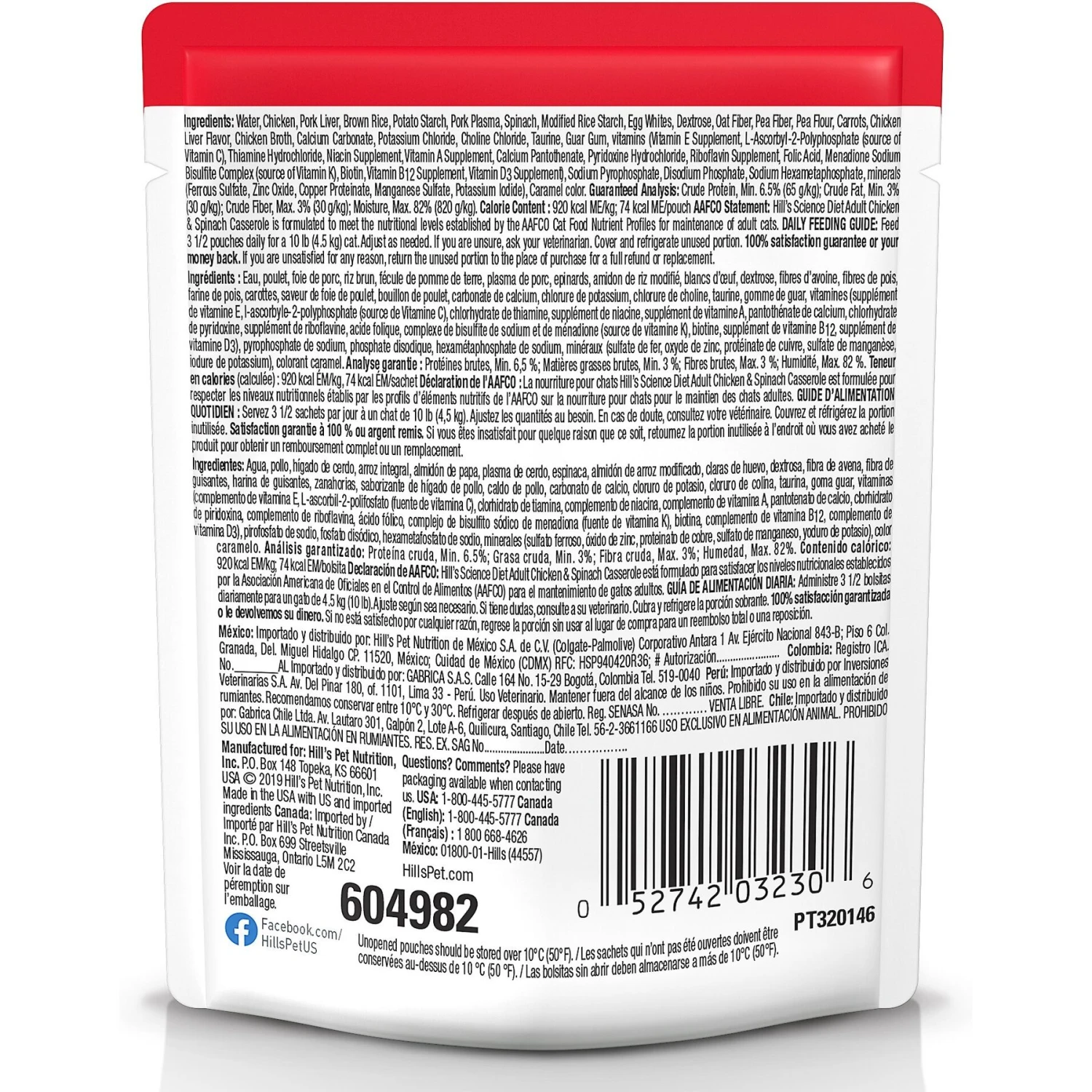 Hill’s Science Diet Adult Chicken & Spinach Casserole Recipe Cat Food brings all the deliciousness of a home-cooked meal straight to your feline friend’s bowl. This mouthwatering medley features chicken, brown rice, carrots and spinach, all purr-fectly mixed in a decadent gravy sauce to speak to your cat’s love of moist and tender food! The digestible recipe was made in the USA and comes in an easy-to-open pouch that requires no can opener. Antioxidants and vitamins C and E support a strong immune system while protein helps build lean muscles, fueling your pet with the strength she needs to take on any extra-tall cat tree!