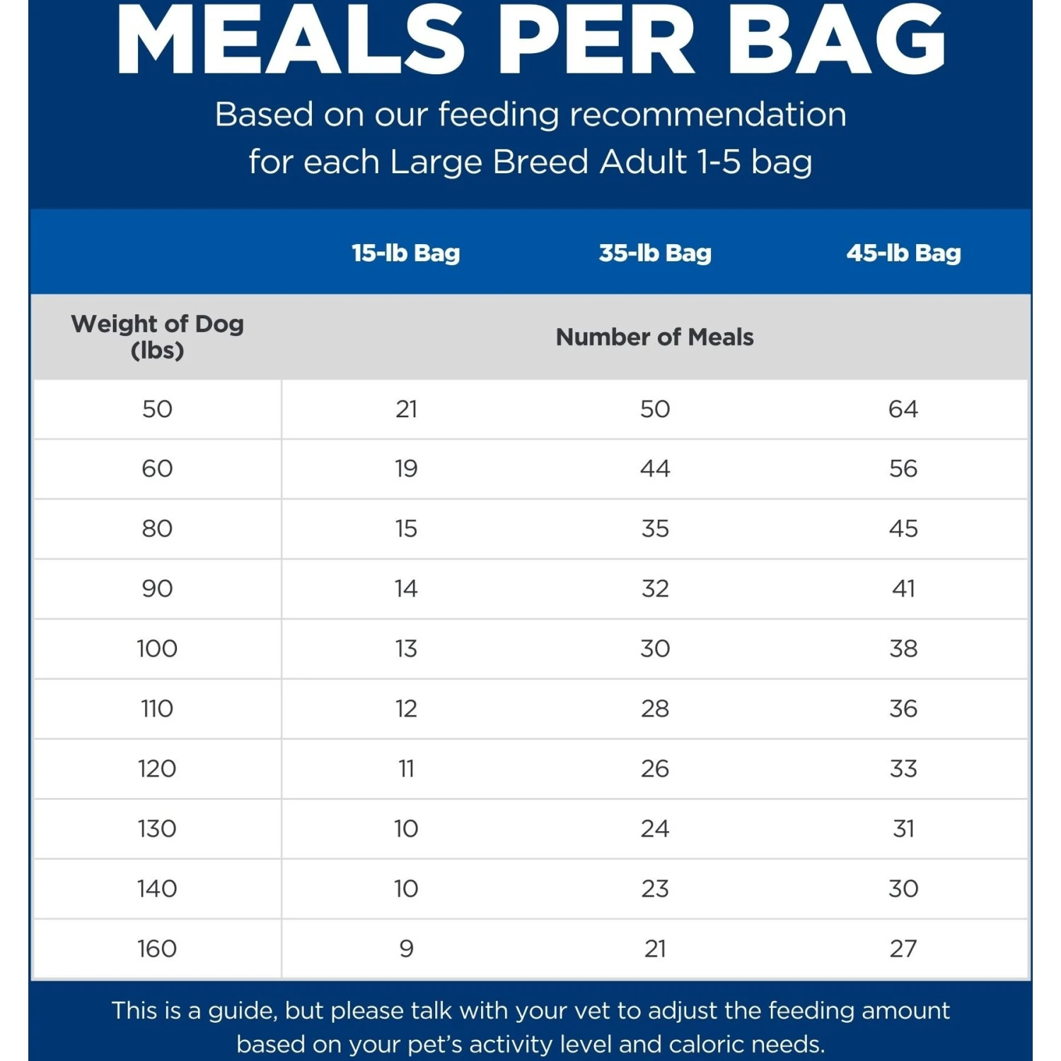 Give your four-legged friend the nutrition he needs for lifelong health and happiness with Hill’s Science Diet Adult Large Breed Dry Dog Food. Featuring real chicken as the very first ingredient, it’s scientifically formulated to provide complete and balanced nutrition that’s tailored to deliver a visible difference in large breed dogs. Natural sources of glucosamine and chondroitin provide the building blocks of healthy cartilage and joints for ideal mobility, while the added vitamins, minerals and nutrients deliver clinically-proven antioxidant benefits.