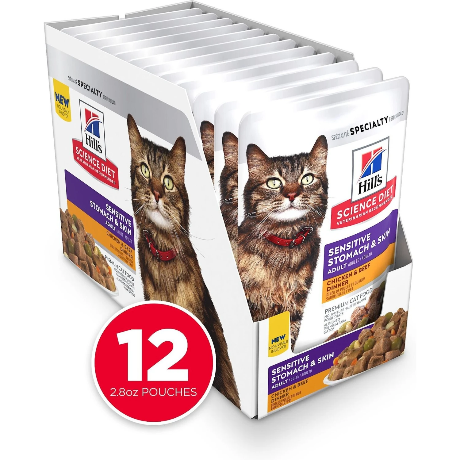 Help your cat’s skin and fur look its most lustrous with Hill’s Science Diet Adult Sensitive Stomach & Skin Chicken & Beef Canned Cat Food. When mealtime comes around, simply rip open the convenient pouch and feed the chunks of chicken and beef directly or use it as a kibble topper. This wet cat food provides a balanced meal while helping support digestive and skin health.