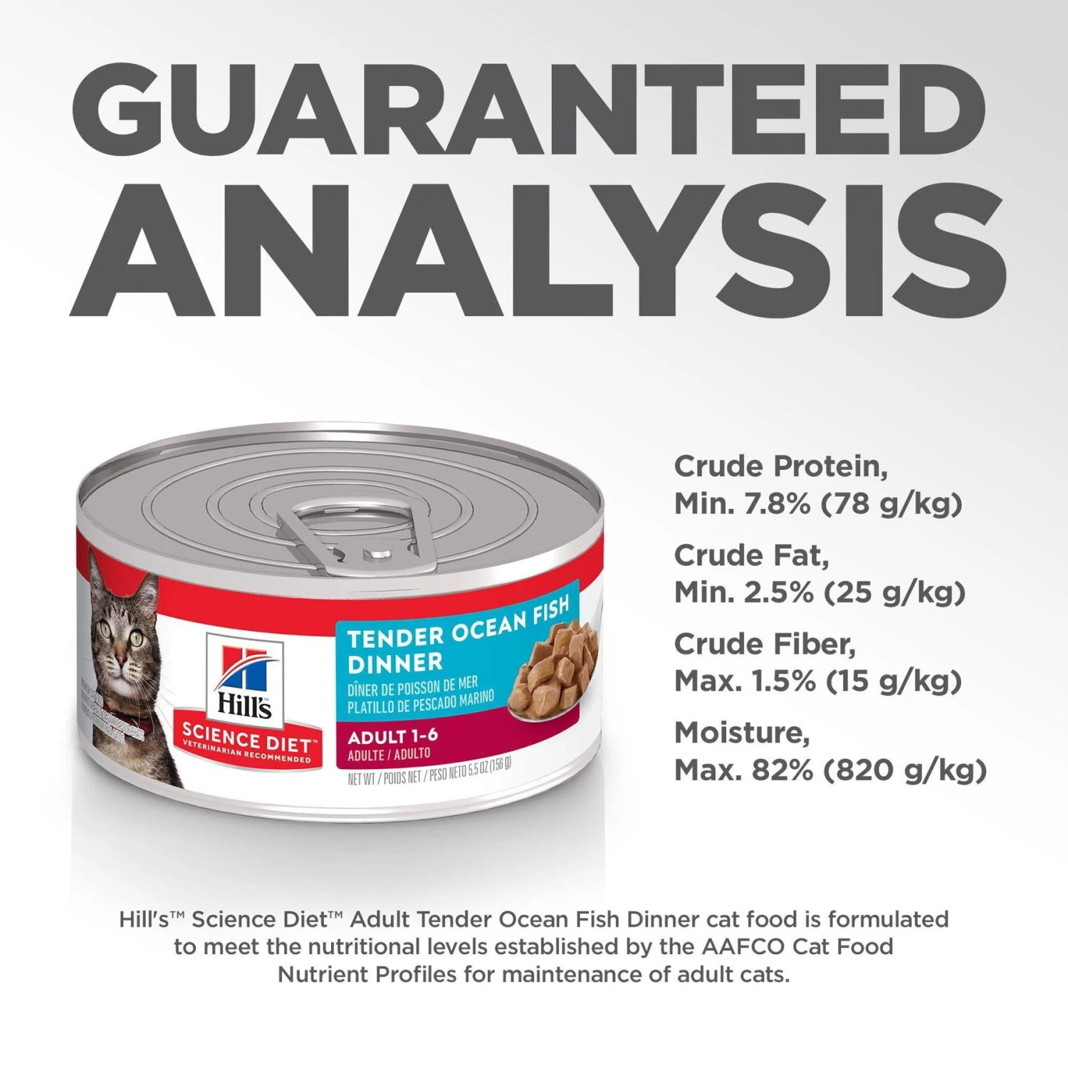 Hill’s Science Diet Adult Tender Ocean Fish Dinner Canned Cat Food provides your four-legged friend with great tasting nutrition for a long, happy life. Made with wholesome ingredients such as tender baked ocean fish and chicken, this nourishing recipe is balanced to meet your pet’s needs, support healthy digestion and promote an ideal body weight. Manufactured in the United States, every ingredient meets strict requirements for purity and nutrient content which exceed industry standards. Formulated for adult cats from 1 to 6 years of age, this Hill’s Science Diet provides your cat the nutrition she needs for a lifetime of health and happiness.