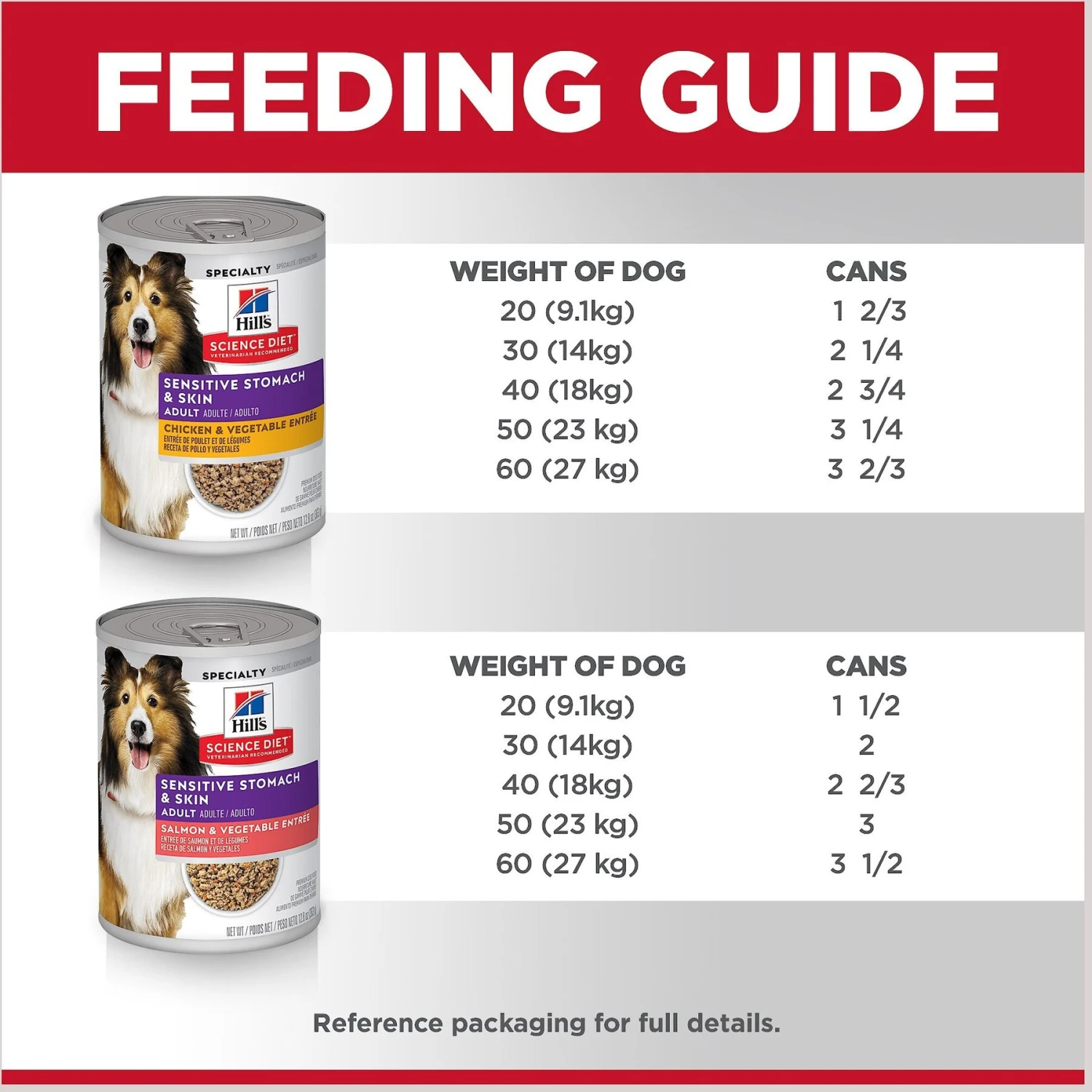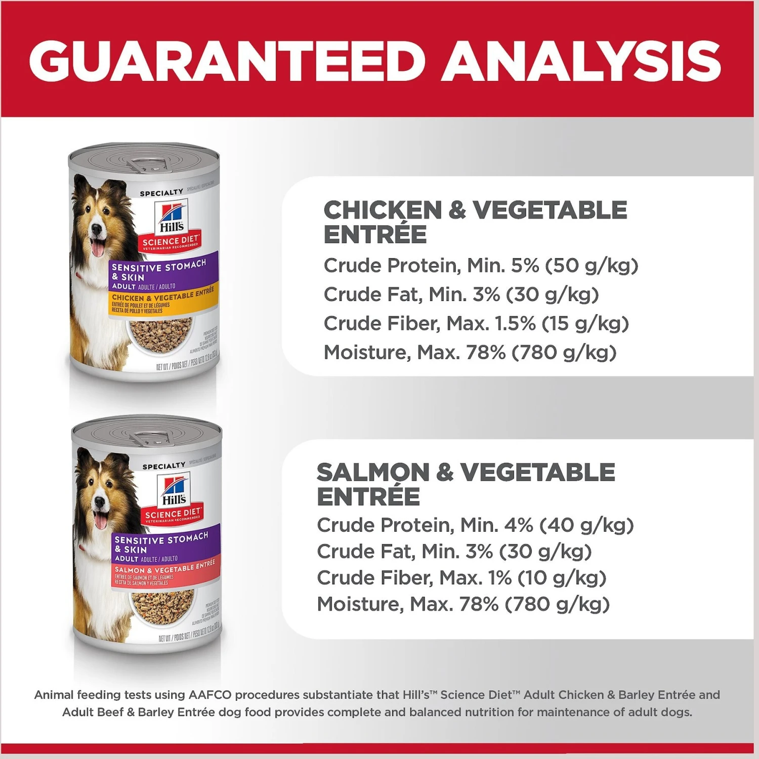 Help support your dog’s stomach and skin health with Hill’s Science Diet Sensitive Stomach & Skin Variety Pack. This adult canned dog food is made in the USA with global ingredients you can trust. It helps to support digestive health, nourish the skin and promotes a lustrous coat. Open up a can and feed your furry friend a wag-worthy entrée as a balanced meal or serve it as a topper for her Science Diet dry dog food!