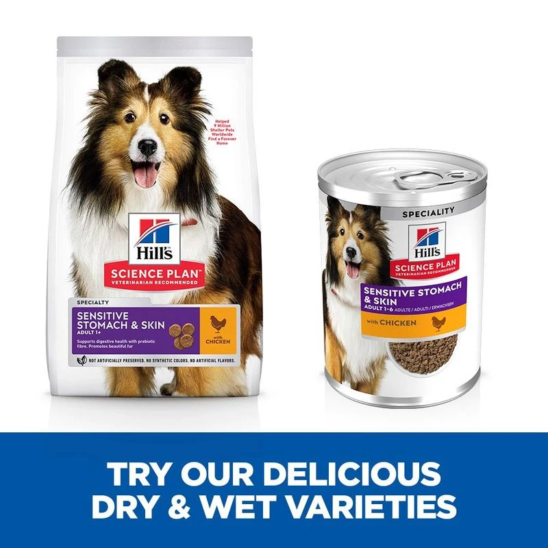 Hill’s Science Plan Adult Sensitive Stomach & Skin is a specially developed wet food for your adult dog. It supports natural digestion and the balance of the microbiome thanks to prebiotic fibres. This food ensures optimum nutrient absorption so that your dog gets all the essential vitamins, minerals and trace elements it needs.